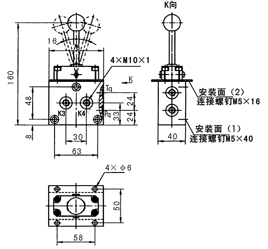 用途與特征: 2KQF型操縱氣閥是切換多路氣控閥氣缸的操縱氣閥。搬動(dòng)手柄可在二個(gè)不同位置分別控制多路閥工作。具有其重量輕,體積小,對(duì)環(huán)境無(wú)污染,靈敏度高得多等優(yōu)點(diǎn)。是5噸位以上自卸汽車(chē)氣路控制的一種理想元件。2KQF型操縱氣閥的原始位置Pq口與T口是封閉的,各控制口K與Tq口相通。搬動(dòng)手柄可在二個(gè)不同角度。