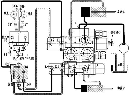 舉升泵供油進(jìn)入QDF-L20型氣控多路閥后,通過操作氣控操作閥不同位置,讓壓縮空氣分別進(jìn)入該閥所帶氣缸,當(dāng)推動舉升閥閥芯時,可實現(xiàn)車箱舉升、中停、下降等功能;當(dāng)推動換向閥閥芯時,可實現(xiàn)車箱頂蓋開啟、閉合等功能。