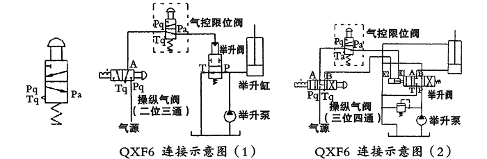 用途與特征: QXF6型氣控限位閥是二位三通型的氣動(dòng)元件,以壓縮空氣為工作介質(zhì),在各種自卸車的控制氣路中它與舉升閥的控制氣缸管路串接在一起使用,是自卸車舉升至極限位置時(shí)起限位作用控制閥。 QXF6型氣控限位閥的原始位置Pq口與Pa口是連通的(常開(kāi)式結(jié)構(gòu))。在連接示意圖(1)中搬動(dòng)操縱氣閥的手柄換向至工作位置(Pq口與A口連通)將壓縮空氣經(jīng)氣控限位閥進(jìn)入舉升閥氣缸使舉升閥換向?qū)崿F(xiàn)液壓缸上升。當(dāng)車廂舉升到最大轉(zhuǎn)角位置時(shí),限位機(jī)構(gòu)將氣控限位閥的限位桿壓下切斷其進(jìn)氣口(Pq口與Pa口是斷開(kāi)),Pa口與Tq口接通使舉升閥氣缸內(nèi)的壓縮空氣由氣控限位閥排入大氣。這時(shí)舉升閥P口與T口瞬間連通,舉升缸即下降一段距離(車廂舉升轉(zhuǎn)角變小),隨車廂舉升轉(zhuǎn)角變小氣控限位閥的限位桿恢復(fù)原始狀態(tài)同時(shí)壓縮空氣經(jīng)該閥再次進(jìn)入舉升閥氣缸使舉升缸,上升(車廂再次舉升到最大轉(zhuǎn)角位置)。 在氣控限位閥的限位桿行程范圍內(nèi)(即Pa口的閉合開(kāi)啟閉合)實(shí)現(xiàn)車廂下降舉升下降往復(fù)變化過(guò)程,使車廂產(chǎn)生輕微抖動(dòng)有利于將車廂內(nèi)的殘留物體卸掉。在連接示意圖(2)中搬動(dòng)操縱氣閥的手柄換向至工作位置(Pq口與A口連通)將壓縮空氣經(jīng)氣控限位閥進(jìn)入舉升閥的氣缸K1口實(shí)現(xiàn)液壓缸上升。當(dāng)車廂舉升到最大轉(zhuǎn)角位置時(shí),限位機(jī)構(gòu)將氣控限位閥的限位桿壓下切斷其進(jìn)氣口(Pq口與Pa口是斷開(kāi)),Pa口與Tq口接通使舉升閥氣缸內(nèi)的壓縮空氣由氣控限位閥排入大氣。這時(shí)舉升閥回到中位,P口經(jīng)B口與T口連通回油,A口關(guān)閉車廂處于最高舉升位置狀態(tài)。