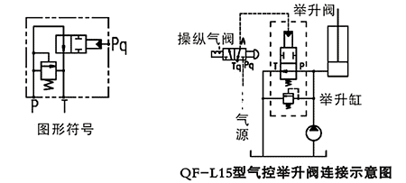 QJF-E15(20)L型氣控舉升閥的原始位置P口與T口是連通的(常開式結(jié)構(gòu))。該閥工作時,利用壓縮空氣通過氣缸推動閥芯封閉,油路由常通位置轉(zhuǎn)為工作位置,即實現(xiàn)車廂的舉升;切斷氣源P口與T口接通油液流入油箱,系統(tǒng)卸荷車廂下降。