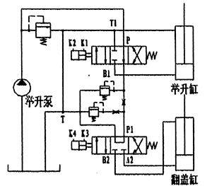 當氣控多路閥處于中間位置時,使車廂舉升位置保持不變,同時系統(tǒng)壓力油供另一組帶附加功能(翻蓋功能)的閥片工作即可實現(xiàn)車廂翻蓋的閉合—展開功能。該閥的工作原理示意圖如下